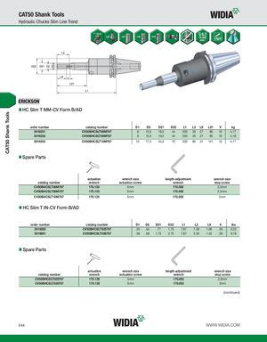 CAT50 Shank Tools CAT50 Shank Tools Hydraulic Chucks Slim Line Trend HC Slim T MM-CV Form B/AD order number catalog number D1 D2 D21 D22 L1 L2 L9 L21 V kg 3019251 CV50BHCSLT06M787 6 13,5 19,5 44 200 35 27 85 10 4,17 3019252 CV50BHCSLT08M787 8 15,5 19,5 44 200 35 27 85 10 4,18 3019253 CV50BHCSLT10M787 10 17,5 44,5 70 200 85 31 141 10 4,17 Spare Parts actuation wrench size length-adjustment wrench size catalog number wrench actuation screw wrench stop screw CV50BHCSLT06M787 170.135 5mm 170.002 2,5mm CV50BHCSLT08M787 170.135 5mm 170.002 2,5mm CV50BHCSLT10M787 170.135 5mm 170.003 3mm HC Slim T IN-CV Form B/AD order number catalog number D1 D2 D21 D22 L1 L2 L9 V lbs 3019260 CV50BHCSLT025787 .25 .54 .77 1.75 7.87 1.38 1.06 .39 9.22 3019261 CV50BHCSLT038787 .38 .69 1.75 2.75 7.87 3.35 1.22 .39 9.19 Spare Parts actuation wrench size length-adjustment wrench size catalog number wrench actuation screw wrench stop screw CV50BHCSLT025787 170.135 5mm 170.002 2,5mm CV50BHCSLT038787 170.135 5mm 170.003 3mm (continued) E44 WWW.WIDIA.COM
