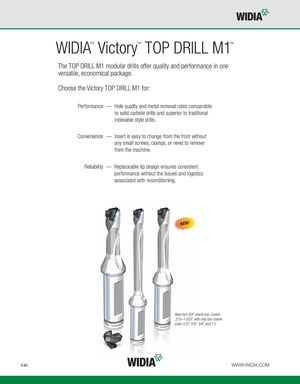 WIDIA™ Victory™ TOP DRILL M1™ The TOP DRILL M1 modular drills offer quality and performance in one versatile, economical package. Choose the Victory TOP DRILL M1 for: Performance — Hole quality and metal removal rates comparable to solid carbide drills and superior to traditional indexable style drills. Convenience — Insert is easy to change from the front without any small screws, clamps, or need to remove from the machine. Reliability — Replaceable tip design ensures consistent performance without the issues and logistics associated with reconditioning. NEW! New Inch SCF shank line. Covers .315–1.023" with only four shank sizes (1/2", 5/8", 3/4", and 1"). E46 WWW.WIDIA.COM