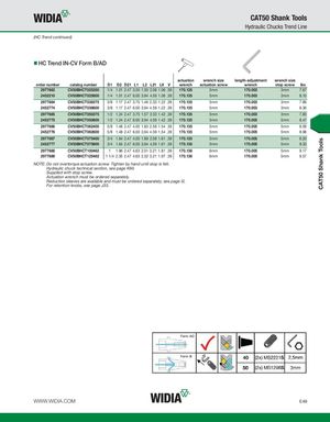 CAT50 Shank Tools CAT50 Shank Tools Hydraulic Chucks Trend Line (HC Trend continued) HC Trend IN-CV Form B/AD actuation wrench size length-adjustment wrench size order number catalog number D1 D2 D21 L1 L2 L21 L9 V wrench actuation screw wrench stop screw lbs 2977683 CV50BHCT025350 1/4 1.01 2.47 3.50 1.30 2.08 1.06 .39 170.135 5mm 170.003 3mm 7.67 2452210 CV50BHCT025600 1/4 1.01 2.47 6.00 3.94 4.59 1.06 .39 170.135 5mm 170.003 3mm 8.10 2977684 CV50BHCT038375 3/8 1.17 2.47 3.75 1.46 2.33 1.22 .39 170.135 5mm 170.003 3mm 7.89 2452774 CV50BHCT038600 3/8 1.17 2.47 6.00 3.94 4.59 1.22 .39 170.135 5mm 170.003 3mm 8.36 2977685 CV50BHCT050375 1/2 1.24 2.47 3.75 1.57 2.33 1.42 .39 170.135 5mm 170.003 3mm 7.83 2452775 CV50BHCT050600 1/2 1.24 2.47 6.00 3.94 4.59 1.42 .39 170.135 5mm 170.005 5mm 8.47 2977686 CV50BHCT062400 5/8 1.48 2.47 4.00 1.83 2.58 1.54 .39 170.135 5mm 170.005 5mm 8.09 2452776 CV50BHCT062600 5/8 1.48 2.47 6.00 3.94 4.59 1.54 .39 170.135 5mm 170.005 5mm 8.98 2977687 CV50BHCT075400 3/4 1.64 2.47 4.00 1.89 2.58 1.61 .39 170.135 5mm 170.005 5mm 8.20 2452777 CV50BHCT075600 3/4 1.64 2.47 6.00 3.94 4.59 1.61 .39 170.135 5mm 170.005 5mm 9.33 2977688 CV50BHCT100462 1 1.96 2.47 4.63 2.01 3.21 1.81 .39 170.136 6mm 170.005 5mm 9.17 2977689 CV50BHCT125462 1 1/4 2.35 2.47 4.63 2.32 3.21 1.97 .39 170.136 6mm 170.005 5mm 9.57 NOTE: Do not overtorque actuation screw. Tighten by hand until stop is felt. Hydraulic chuck technical section, see page K60. Supplied with stop screw. Actuation wrench must be ordered separately. Reduction sleeves are available and must be ordered separately; see page I2. For retention knobs, see page J33. WWW.WIDIA.COM E49