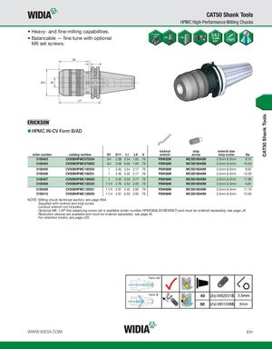 CAT50 Shank Tools CAT50 Shank Tools HPMC High-Performance Milling Chucks • Heavy- and fine-milling capabilities. • Balancable — fine tune with optional M6 set screws. HPMC IN-CV Form B/AD locknut stop wrench size order number catalog number D1 D11 L1 L9 V wrench screw stop screw lbs 3100403 CV50BHPMC075354 3/4 2.09 3.54 1.93 .79 PSW52M MCSS16040M 2,5mm & 5mm 8.10 3100404 CV50BHPMC075650 3/4 2.09 6.50 1.93 .79 PSW52M MCSS16040M 2,5mm & 5mm 10.50 3100405 CV50BHPMC100354 1 2.40 3.54 2.17 .79 PSW58M MCSS16040M 2,5mm & 5mm 8.50 3100406 CV50BHPMC100531 1 2.40 5.32 2.17 .79 PSW58M MCSS16040M 2,5mm & 5mm 10.50 3100407 CV50BHPMC100650 1 2.40 6.50 2.17 .79 PSW58M MCSS16040M 2,5mm & 5mm 11.85 3100408 CV50BHPMC125354 1 1/4 2.76 3.54 2.28 .79 PSW68M MCSS16040M 2,5mm & 5mm 9.00 3100409 CV50BHPMC125531 1 1/4 2.91 5.32 2.95 .79 PSW68M MCSS16040M 2,5mm & 5mm 11.70 3100410 CV50BHPMC125650 1 1/4 2.91 6.50 2.95 .79 PSW68M MCSS16040M 2,5mm & 5mm 13.50 NOTE: Milling chuck technical section, see page K64. Supplied with locknut and stop screw. Locknut wrench not included. Optional M6~1,0P fine-balancing screw set is available (order number HPMCBALSCREWSET) and must be ordered separately; see page J4. Reduction sleeves are available and must be ordered separately; see page I6. For retention knobs, see page J33. WWW.WIDIA.COM E51