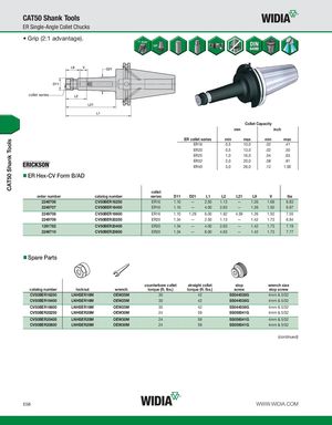 CAT50 Shank Tools CAT50 Shank Tools ER Single-Angle Collet Chucks • Grip (2:1 advantage). collet series Collet Capacity mm inch ER collet series min max min max ER16 0,5 10,0 .02 .41 ER20 0,5 13,0 .02 .50 ER25 1,0 16,0 .04 .63 ER32 2,0 20,0 .08 .81 ER40 3,0 26,0 .12 1.00 ER Hex-CV Form B/AD collet order number catalog number series D11 D21 L1 L2 L21 L9 V lbs 2249706 CV50BER16250 ER16 1.10 — 2.50 1.13 — 1.26 1.69 6.83 2249707 CV50BER16400 ER16 1.10 — 4.00 2.63 — 1.26 1.50 6.97 2249708 CV50BER16600 ER16 1.10 1.29 6.00 1.92 4.59 1.26 1.50 7.55 2249709 CV50BER20250 ER20 1.34 — 2.50 1.13 — 1.42 1.73 6.84 1261782 CV50BER20400 ER20 1.34 — 4.00 2.63 — 1.42 1.73 7.19 2249710 CV50BER20600 ER20 1.34 — 6.00 4.63 — 1.42 1.73 7.77 Spare Parts counterbore collet straight collet stop wrench size catalog number locknut wrench torque (ft. lbs.) torque (ft. lbs.) screw stop screw CV50BER16250 LNHSER16M OEW25M 30 42 SS044038G 4mm & 5/32 CV50BER16400 LNHSER16M OEW25M 30 42 SS044038G 4mm & 5/32 CV50BER16600 LNHSER16M OEW25M 30 42 SS044038G 4mm & 5/32 CV50BER20250 LNHSER20M OEW30M 24 59 SS056041G 4mm & 5/32 CV50BER20400 LNHSER20M OEW30M 24 59 SS056041G 4mm & 5/32 CV50BER20600 LNHSER20M OEW30M 24 59 SS056041G 4mm & 5/32 (continued) E58 WWW.WIDIA.COM