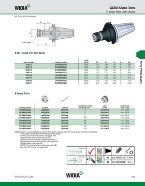 CAT50 Shank Tools CAT50 Shank Tools ER Single-Angle Collet Chucks (ER Form B/AD continued) collet series ER Round-CV Form B/AD collet order number catalog number series D11 L1 L9 V lbs 2249711 CV50BER25250 ER25 1.65 2.50 1.57 1 6.85 2249712 CV50BER25400 ER25 1.65 4.00 1.57 2 7.61 2249713 CV50BER25600 ER25 1.65 6.00 1.57 2 8.44 2249714 CV50BER32275 ER32 1.97 2.75 1.81 1 6.91 1261783 CV50BER32400 ER32 1.97 4.00 1.81 1 7.78 2249715 CV50BER32600 ER32 1.97 6.00 1.81 1 9.19 2249716 CV50BER40300 ER40 2.48 3.00 2.05 1 7.21 2249717 CV50BER40600 ER40 2.48 6.00 2.05 4 10.58 Spare Parts counterbore collet stop wrench size catalog number locknut wrench torque (ft. lbs.) screw stop screw CV50BER25250 LNSER25M ER25WM 77 SS075041G 4mm & 5/32 CV50BER25400 LNSER25M ER25WM 77 SS075041G 4mm & 5/32 CV50BER25600 LNSER25M ER25WM 77 SS075041G 4mm & 5/32 CV50BER32275 LNSER32M ER32WM 100 SS094041G 4mm & 5/32 CV50BER32400 LNSER32M ER32WM 100 SS094041G 4mm & 5/32 CV50BER32600 LNSER32M ER32WM 100 SS094041G 4mm & 5/32 CV50BER40300 LNSER40M ER40WM 130 SS112041G 4mm & 5/32 CV50BER40600 LNSER40M ER40WM 130 SS112041G 4mm & 5/32 NOTE: Collet must be loaded into locknut first. Before loading into the chuck body, insert the cutting tool, then tighten to the recommended tightening torque. Collet chuck technical section, see page K74. Supplied with locknut and stop screw. Locknut wrench must be ordered separately. ER standard straight-bore collets, see page I50. ER tap collets, see page I58. ER TCT tension-only tap collets, see page I60. For retention knobs, see page J33. WWW.WIDIA.COM E59