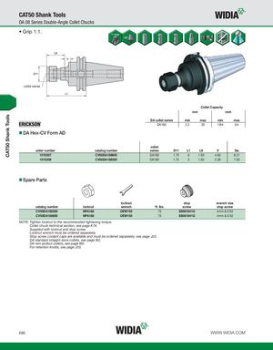 CAT50 Shank Tools CAT50 Shank Tools DA 08 Series Double-Angle Collet Chucks • Grip 1:1. collet series Collet Capacity mm inch DA collet series min max min max DA180 2,2 20 1/64 3/4 DA Hex-CV Form AD collet order number catalog number series D11 L1 L9 V lbs 1015307 CV50DA188600 DA180 1.73 6 1.93 4.65 8.21 1015306 CV50DA188300 DA180 1.73 3 1.93 2.36 7.03 Spare Parts locknut stop wrench size catalog number locknut wrench ft. lbs. screw stop screw CV50DA188300 NPA188 OEW150 75 SS081041G 4mm & 5/32 CV50DA188600 NPA188 OEW150 75 SS081041G 4mm & 5/32 NOTE: Tighten locknut to the recommended tightening torque. Collet chuck technical section, see page K74. Supplied with locknut and stop screw. Locknut wrench must be ordered separately. Stop screw coolant caps are available and must be ordered separately; see page J22. DA standard straight-bore collets, see page I62. DA non-pullout collets, see page I65. For retention knobs, see page J33. E60 WWW.WIDIA.COM