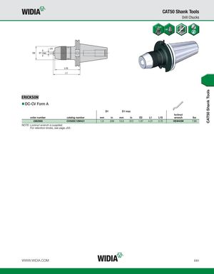 CAT50 Shank Tools CAT50 Shank Tools Drill Chucks DC-CV Form A D1 D1 max locknut order number catalog number mm in mm in D2 L1 L1S wrench lbs 2262968 CV50DC13M421 1,0 .039 13,0 .512 1.97 4.21 3.72 HSW45M 7.85 NOTE: Locknut wrench is supplied. For retention knobs, see page J33. WWW.WIDIA.COM E61