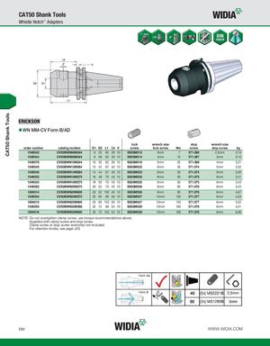 CAT50 Shank Tools CAT50 Shank Tools Whistle Notch™ Adapters WN MM-CV Form B/AD lock wrench size stop wrench size order number catalog number D1 D2 L1 L9 V screw lock screw Nm screw stop screw kg 1549343 CV50BWN06M244 6 25 62 30 10 SS03M012 3mm 7 571.060 2,5mm 3,14 1549344 CV50BWN08M244 8 28 62 30 10 SS03M014 4mm 15 571.067 3mm 3,10 1549378 CV50BWN10M244 10 35 62 35 10 SS03M018 5mm 25 571.068 4mm 3,21 1549345 CV50BWN12M264 12 42 67 40 10 SS03M023 6mm 35 571.074 5mm 3,32 1549346 CV50BWN14M264 14 44 67 40 10 SS03M023 6mm 35 571.074 5mm 3,30 1549352 CV50BWN16M275 16 48 70 43 10 SS03M025 6mm 50 571.075 6mm 3,41 1549353 CV50BWN18M275 18 50 70 43 10 SS03M025 6mm 50 571.075 6mm 3,43 1549362 CV50BWN20M275 20 52 70 45 10 SS03M026 8mm 95 571.076 6mm 3,43 1804514 CV50BWN20M600 20 52 152 45 10 SS03M026 8mm 95 571.076 6mm 4,67 1549354 CV50BWN25M375 25 65 95 50 10 SS03M027 10mm 135 571.077 6mm 4,23 1804515 CV50BWN25M600 25 65 152 50 10 SS03M027 10mm 135 571.077 6mm 5,52 1549355 CV50BWN32M388 32 72 99 54 10 SS03M029 10mm 160 571.076 6mm 4,51 1804516 CV50BWN32M600 32 72 152 54 10 SS03M029 10mm 160 571.076 6mm 6,06 NOTE: Do not overtighten clamp screw; use torque recommendations above. Supplied with clamp screw and stop screw. Clamp screw or stop screw wrenches not included. For retention knobs, see page J33. E62 WWW.WIDIA.COM