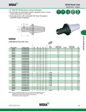 CAT50 Shank Tools CAT50 Shank Tools Whistle Notch™ Adapters • 5° NAS 987 Whistle Notch cutting toolholders. • No through-the-toolholder coolant capability (Form A only), unless stop screw is removed. • Axial adjustment with consistant 3/8" drive throughout complete range of adapters. WN NAS-CV Form AD • Inch lock wrench size wrench size order number catalog number D1 D2 L1 L9 V screw clamp screw ft. lbs. stop screw lbs 3594645 CV50WNA038282 3/8 1.38 2.82 1.19 .38 — 3/16 15 3/8 7.33 3594646 CV50WNA038469 3/8 1.38 4.69 1.19 .38 — 3/16 15 3/8 7.94 3594647 CV50WNA038669 3/8 1.38 6.69 1.19 .38 — 3/16 15 3/8 8.59 3594648 CV50WNA050273 1/2 1.63 2.73 1.40 .38 — 3/16 15 3/8 7.45 3594649 CV50WNA050460 1/2 1.63 4.60 1.40 .38 — 3/16 15 3/8 8.37 3594650 CV50WNA050660 1/2 1.63 6.60 1.40 .38 — 3/16 15 3/8 9.36 3594651 CV50WNA062266 5/8 1.81 2.66 1.52 .38 — 1/4 60 3/8 7.55 3594652 CV50WNA062453 5/8 1.81 4.53 1.52 .38 — 1/4 60 3/8 8.75 3594653 CV50WNA062653 5/8 1.81 6.53 1.52 .38 — 1/4 60 3/8 10.02 3594654 CV50WNA075263 3/4 2.00 2.63 1.54 .38 — 1/4 60 3/8 7.60 3594655 CV50WNA075450 3/4 2.00 4.50 1.65 .38 — 1/4 60 3/8 9.14 3594656 CV50WNA075650 3/4 2.00 6.50 1.65 .38 — 1/4 60 3/8 10.73 3594657 CV50WNA088263 7/8 2.25 2.63 1.53 .38 — 1/4 60 3/8 7.78 3594658 CV50WNA088450 7/8 2.25 4.50 1.64 .38 — 1/4 60 3/8 9.74 3594659 CV50WNA088650 7/8 2.25 6.50 1.64 .38 — 1/4 60 3/8 11.88 3594660 CV50WNA100300 1 2.63 3.00 1.90 .38 S-1820 3/8 110 3/8 8.57 3594661 CV50WNA100450 1 2.63 4.50 1.90 .38 S-1820 3/8 110 3/8 10.75 3594662 CV50WNA100650 1 2.63 6.50 1.90 .38 S-1820 3/8 110 3/8 13.68 3594663 CV50WNA125300 1 1/4 2.88 3.00 1.90 .38 S-1820 3/8 110 3/8 8.80 3594664 CV50WNA125450 1 1/4 2.88 4.50 1.90 .38 S-1820 3/8 110 3/8 11.44 3594665 CV50WNA125650 1 1/4 2.88 6.50 1.90 .38 S-1820 3/8 110 3/8 14.98 3594666 CV50WNA150400 1 1/2 3.13 4.00 1.90 .38 S-1820 3/8 110 3/8 10.95 3594667 CV50WNA200535 2 4.00 5.35 3.01 .38 S-1820 3/8 110 3/8 16.44 3594668 CV50WNA200735 2 4.00 7.35 3.01 .38 S-1820 3/8 110 3/8 23.42 3594669 CV50WNA250535 2 1/2 5.00 5.35 3.01 .38 — 3/8 110 3/8 22.44 3594670 CV50WNA250735 2 1/2 5.00 7.35 3.01 .38 — 3/8 110 3/8 26.77 3594671 CV50ZWNA200375 2 3.75 3.75 3.01 .38 S-1820 3/8 110 3/8 11.48 NOTE: Do not overtighten clamp screw; use torque recommendations above. Supplied with clamp screw and stop screw (3/4"-10 RH x 2.25lg). Clamp screw or stop screw wrenches not included. For retention knobs, see page J33. WWW.WIDIA.COM E63