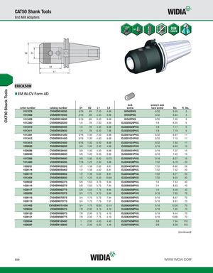 CAT50 Shank Tools CAT50 Shank Tools End Mill Adapters EM IN-CV Form AD lock wrench size order number catalog number D1 D2 L1 L9 screw lock screw lbs ft. lbs. 1013379 CV50EM018250 3/16 .69 2.50 4.69 S1045PKG 3/32 6.55 3 1013408 CV50EM018450 3/16 .69 4.50 6.69 S1045PKG 3/32 6.84 3 1013409 CV50EM018650 3/16 .69 6.50 8.69 S1045PKG 3/32 7.05 3 1013380 CV50EM025250 1/4 .78 2.50 4.69 ELS025025PKG 1/8 6.55 5 1013410 CV50EM025450 1/4 .78 4.50 6.69 ELS025025PKG 1/8 7.17 5 1013411 CV50EM025650 1/4 .78 6.50 7.68 ELS025025PKG 1/8 7.19 5 1013381 CV50EM031250 5/16 1.00 2.50 4.69 ELS031031PKG 5/32 6.61 11 1013412 CV50EM031450 5/16 1.00 4.50 6.69 ELS031031PKG 5/32 7.15 11 1013413 CV50EM031650 5/16 1.00 6.50 8.69 ELS031031PKG 5/32 7.60 11 1026020 CV50EM038250 3/8 1.00 2.50 4.69 ELS038031PKG 3/16 6.63 15 1026286 CV50EM038450 3/8 1.00 4.50 6.69 ELS038031PKG 3/16 7.07 15 1026093 CV50EM038650 3/8 1.00 6.50 8.69 ELS038031PKG 3/16 7.45 15 1013382 CV50EM038850 3/8 1.00 8.50 10.70 ELS038031PKG 3/16 8.27 15 1013383 CV50EM044250 7/16 1.25 2.50 4.69 ELS044038PKG 7/32 6.78 20 1026021 CV50EM050262 1/2 1.38 2.62 4.81 ELS044038PKG 7/32 6.82 20 1026114 CV50EM050462 1/2 1.38 4.62 6.81 ELS044038PKG 7/32 7.52 20 1026115 CV50EM050662 1/2 1.38 6.62 8.81 ELS044038PKG 7/32 8.21 20 1013404 CV50EM050850 1/2 1.25 8.50 10.69 ELS044038PKG 7/32 9.03 20 1026022 CV50EM062375 5/8 1.63 3.75 5.94 ELS056050PKG 1/4 7.53 40 1026116 CV50EM062575 5/8 1.63 5.75 7.94 ELS056050PKG 1/4 8.63 40 1026117 CV50EM062775 5/8 1.63 7.75 9.94 ELS056050PKG 1/4 9.48 40 1026250 CV50EM075375 3/4 1.75 3.75 5.94 ELS062050PKG 5/16 7.65 70 1026118 CV50EM075575 3/4 1.75 5.75 7.94 ELS062050PKG 5/16 8.67 70 1026119 CV50EM075775 3/4 1.75 7.75 7.91 ELS062050PKG 5/16 9.81 70 1013405 CV50EM0751000 3/4 1.75 10.00 12.19 ELS062050PKG 5/16 12.25 70 1026023 CV50EM088375 7/8 2.00 3.75 4.19 ELS062050PKG 5/16 7.65 70 1026120 CV50EM088575 7/8 2.00 5.75 4.19 ELS062050PKG 5/16 9.44 70 1026121 CV50EM088775 7/8 2.00 7.75 4.19 ELS062050PKG 5/16 10.85 70 1026044 CV50EM100400 1 2.00 4.00 4.49 ELS075056PKG 3/8 7.94 110 1026287 CV50EM100600 1 2.00 6.00 4.49 ELS075056PKG 3/8 9.39 110 (continued) E66 WWW.WIDIA.COM