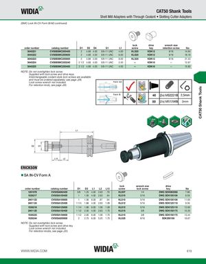 CAT50 Shank Tools CAT50 Shank Tools Shell Mill Adapters with Through Coolant • Slotting Cutter Adapters (SMC Lock IN-CV Form B/AD continued) lock drive wrench size order number catalog number D1 D2 D4 G1 L1 screw key retention screw lbs 3640221 CV50BSMC200400 2 4.88 4.00 5/8-11 UNC 4.00 KLS20 KDK12 9/16 14.94 3640222 CV50BSMC200600 2 4.88 4.00 5/8-11 UNC 6.00 KLS20 KDK12 9/16 18.18 3640223 CV50BSMC200800 2 4.88 4.00 5/8-11 UNC 8.00 KLS20 KDK12 9/16 21.43 3640224 CV50BSMC250240 2 1/2 4.88 4.00 5/8-11 UNC 2.40 — KDK16 — 12.87 3640225 CV50BSMC250400 2 1/2 4.88 4.00 5/8-11 UNC 4.00 — KDK16 — 15.80 NOTE: Do not overtighten lock screw. Supplied with lock screw and drive keys. Interchangeable coolant-style lock screws are available and must be ordered separately; see page J26. Lock screw wrench not included. For retention knob, see page J33. SA IN-CV Form A lock wrench size drive order number catalog number D1 D2 L1 L2 L13 screw lock screw key lbs 1261878 CV50SA062400 5/8 1.25 4.00 2.63 .78 KLS07 1/4 DWG SDK062088 7.96 1026217 CV50SA100400 1 1.56 4.00 2.63 .94 KLS10 5/16 DWG SDK100106 8.59 2461123 CV50SA100600 1 1.56 6.00 .87 .94 KLS10 5/16 DWG SDK100106 11.60 2461124 CV50SA125400 1 1/4 1.88 4.00 2.63 1.09 KLS12 5/16 DWG SDK125119 9.56 1026218 CV50SA125600 1 1/4 1.88 6.00 1.06 1.09 KLS12 5/16 DWG SDK125119 12.60 2461125 CV50SA150400 1 1/2 2.00 4.00 2.63 1.70 KLS15 3/8 DWG SDK150175 10.35 1026223 CV50SA150600 1 1/2 2.00 6.00 1.06 1.70 KLS15 3/8 DWG SDK150175 13.44 1026244 CV50SA200600 2 2.75 6.00 5.25 1.70 KLS20 9/16 SDK200169 16.67 NOTE: Do not overtighten lock screw. Supplied with lock screw and drive key. Lock screw wrench not included. For retention knobs, see page J33. WWW.WIDIA.COM E73
