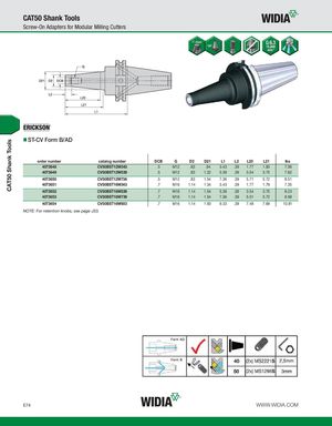 CAT50 Shank Tools CAT50 Shank Tools Screw-On Adapters for Modular Milling Cutters ST-CV Form B/AD order number catalog number DCB G D2 D21 L1 L2 L20 L21 lbs 4073648 CV50BST12M343 .5 M12 .83 .94 3.43 .39 1.77 1.83 7.06 4073649 CV50BST12M539 .5 M12 .83 1.22 5.39 .39 3.54 3.75 7.62 4073650 CV50BST12M736 .5 M12 .83 1.54 7.36 .39 5.71 5.72 8.51 4073651 CV50BST16M343 .7 M16 1.14 1.34 3.43 .39 1.77 1.79 7.35 4073652 CV50BST16M539 .7 M16 1.14 1.54 5.39 .39 3.54 3.75 8.23 4073653 CV50BST16M739 .7 M16 1.14 1.54 7.36 .39 5.51 5.72 8.98 4073654 CV50BST16M933 .7 M16 1.14 1.93 9.33 .39 7.48 7.69 10.81 NOTE: For retention knobs, see page J33. E74 WWW.WIDIA.COM