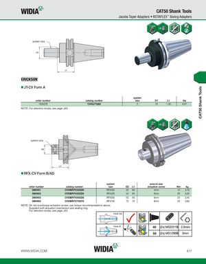 CAT50 Shank Tools CAT50 Shank Tools Jacobs Taper Adapters • ROTAFLEX™ Boring Adapters system size JT-CV Form A system order number catalog number size D1 L1 lbs 1026379 CV50JT3268 3 .81 1.46 6.97 NOTE: For retention knobs, see page J33. system size RFX-CV Form B/AD system wrench size order number catalog number size D2 L1 actuation screw Nm kg 3860901 CV50BRFX320236 RFX320 32 60 4mm 12 3,10 3860902 CV50BRFX420236 RFX420 42 60 5mm 20 3,20 3860903 CV50BRFX550236 RFX550 55 60 6mm 25 3,40 3860904 CV50BRFX720276 RFX720 72 70 6mm 25 3,60 NOTE: Do not overtorque actuation screw; use torque recommendations above. Supplied with actuation mechanism and sealing ring. For retention knobs, see page J33. WWW.WIDIA.COM E77