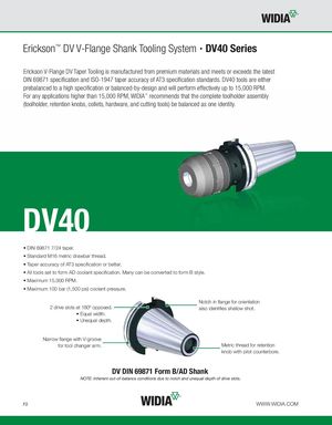 Erickson™ DV V-Flange Shank Tooling System • DV40 Series Erickson V-Flange DV Taper Tooling is manufactured from premium materials and meets or exceeds the latest DIN 69871 specification and ISO-1947 taper accuracy of AT3 specification standards. DV40 tools are either prebalanced to a high specification or balanced-by-design and will perform effectively up to 15,000 RPM. For any applications higher than 15,000 RPM, WIDIA™ recommends that the complete toolholder assembly (toolholder, retention knobs, collets, hardware, and cutting tools) be balanced as one identity. DV40 • DIN 69871 7/24 taper. • Standard M16 metric drawbar thread. • Taper accuracy of AT3 specification or better. • All tools set to form AD coolant specification. Many can be converted to form B style. • Maximum 15,000 RPM. • Maximum 100 bar (1,500 psi) coolant pressure. Notch in flange for orientation 2 drive slots at 180º opposed. also identifies shallow shot. • Equal width. • Unequal depth. Narrow flange with V-groove for tool changer arm. Metric thread for retention knob with pilot counterbore. DV DIN 69871 Form B/AD Shank NOTE: Inherent out-of-balance conditions due to notch and unequal depth of drive slots. F2 WWW.WIDIA.COM