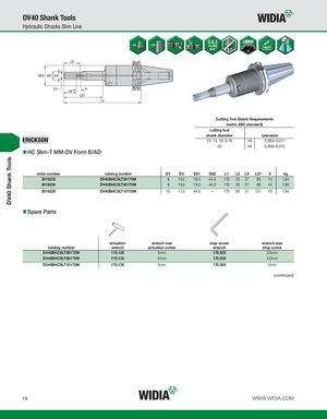DV40 Shank Tools DV40 Shank Tools Hydraulic Chucks Slim Line Cutting Tool Shank Requirements metric (ISO standard) cutting tool shank diameter tolerance 12, 14, 16, & 18 h6 0,000/-0,011 20 h6 0,000/-0,013 HC Slim-T MM-DV Form B/AD order number catalog number D1 D2 D21 D22 L1 L2 L9 L21 V kg 3019233 DV40BHCSLT06170M 6 13,5 19,5 44,5 170 35 27 85 10 1,64 3019234 DV40BHCSLT08170M 8 15,5 19,5 44,5 170 35 27 85 10 1,65 3019235 DV40BHCSLT10170M 10 17,5 44,5 — 170 85 31 151 10 1,64 Spare Parts actuation wrench size stop screw wrench size catalog number wrench actuation screw wrench stop screw DV40BHCSLT06170M 170.135 5mm 170.002 2,5mm DV40BHCSLT08170M 170.135 5mm 170.002 2,5mm DV40BHCSLT10170M 170.135 5mm 170.003 3mm (continued) F8 WWW.WIDIA.COM