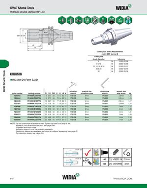 DV40 Shank Tools DV40 Shank Tools Hydraulic Chucks Standard HP Line Cutting Tool Shank Requirements metric (ISO standard) cutting tool shank diameter tolerance 6 h6 0,000/-0,008 8 & 10 h6 0,000/-0,009 12, 14, 16, & 18 h6 0,000/-0,011 20 & 25 h6 0,000/-0,013 32 h6 0,000/-0,016 HC MM-DV Form B/AD actuation wrench size stop screw wrench size order number catalog number D1 D2 D21 L1 L2 L9 V wrench actuation screw wrench stop screw kg 1245443 DV40BHC06072M 6 25,7 50 72 33 30 10 170.135 5mm 170.002 2,5mm 1,12 1245444 DV40BHC08072M 8 27,7 50 72 34 30 10 170.135 5mm 170.002 2,5mm 1,13 1245445 DV40BHC10077M 10 29,7 50 77 39 35 10 170.135 5mm 170.002 2,5mm 1,17 1237451 DV40BHC12077M 12 31,6 50 77 40 35 10 170.135 5mm 170.002 2,5mm 1,18 1245446 DV40BHC14082M 14 33,6 50 82 46 40 10 170.135 5mm 170.003 3mm 1,22 1237452 DV40BHC16082M 16 37,6 50 82 47 40 10 170.135 5mm 170.003 3mm 1,28 1245447 DV40BHC18082M 18 39,6 50 82 47 40 10 170.135 5mm 170.003 3mm 1,31 1191013 DV40BHC20082M 20 41,6 50 82 48 40 10 170.135 5mm 170.003 3mm 1,33 1245448 DV40BHC25117M 25 49,8 63 117 51 51 10 170.136 6mm 170.004 4mm 2,16 1245449 DV40BHC32117M 32 59,8 63 117 59 51 10 170.136 6mm 170.004 4mm 2,34 NOTE: Do not overtorque actuation screw. Tighten by hand until stop is felt. Hydraulic chuck technical section, see page K60. Supplied with stop screw. Actuation wrench must be ordered separately. Reduction sleeves are available and must be ordered separately; see page I2. For retention knobs, see page J33. F10 WWW.WIDIA.COM