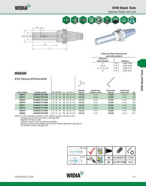 DV40 Shank Tools DV40 Shank Tools Hydraulic Chucks Trend Line Cutting Tool Shank Requirements metric (ISO standard) cutting tool shank diameter tolerance 6 h6 0,000/-0,008 8 & 10 h6 0,000/-0,009 12, 14, 16, & 18 h6 0,000/-0,011 20 h6 0,000/-0,013 HC Trend In-DV Form B/AD actuation wrench size stop screw wrench size order number catalog number D1 D2 D21 L1 L2 L9 V wrench actuation screw wrench stop screw kg 1809973 DV40BHCT06150M 6 26 50 150 105 30 10 170.135 5 mm 170.003 3 mm 1,50 1809974 DV40BHCT08150M 8 28 50 150 105 30 10 170.135 5 mm 170.003 3 mm 1,56 1809975 DV40BHCT10150M 10 30 50 150 105 35 10 170.135 5 mm 170.003 3 mm 1,63 1809976 DV40BHCT12150M 12 32 50 150 105 35 10 170.135 5 mm 170.003 3 mm 1,69 1809977 DV40BHCT14150M 14 34 50 150 105 40 10 170.135 5 mm 170.005 5 mm 1,73 1809978 DV40BHCT16150M 16 38 50 150 105 40 10 170.135 5 mm 170.005 5 mm 1,90 1809979 DV40BHCT18150M 18 40 50 150 105 40 10 170.135 5 mm 170.005 5 mm 1,98 1809980 DV40BHCT20150M 20 42 50 150 105 40 10 170.135 5 mm 170.005 5 mm 2,07 NOTE: Do not overtorque actuation screw. Tighten by hand until stop is felt. Hydraulic chuck technical section, see page K60. Supplied with stop screw. Actuation wrench must be ordered separately. Reduction sleeves are available and must be ordered separately; see page I2. For retention knobs, see page J33. WWW.WIDIA.COM F11