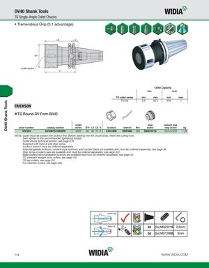 DV40 Shank Tools DV40 Shank Tools TG Single-Angle Collet Chucks • Tremendous Grip (3:1 advantage). collet series Collet Capacity mm inch TG collet series min max min max TG100 2,6 25,5 5/64 1 TG Round-DV Form B/AD collet stop wrench size order number catalog number series D11 L1 L9 V locknut wrench Nm screw stop screw kg 1237204 DV40BTG100080M DV40 60 80 70 8 LNA100M HSW58M 203 SS081041G 4mm & 5/32 1,38 NOTE: Collet must be loaded into locknut first. Before loading into the chuck body, insert the cutting tool, then tighten to the recommended tightening torque. Collet chuck technical section, see page K74. Supplied with locknut and stop screw. Locknut wrench must be ordered separately. Interchangeable locknuts, coolant-style locknuts, and coolant disks are available and must be ordered separately; see page J6. Stop screw coolant caps are available and must be ordered separately; see page J22. Balanceable/interchangeable locknuts are available and must be ordered separately; see page J3. TG standard straight-bore collets, see page I10. TG tap collets, see page I10. For retention knobs, see page J33. F14 WWW.WIDIA.COM