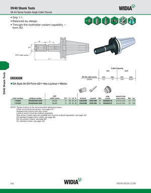 DV40 Shank Tools DV40 Shank Tools DA 04 Series Double-Angle Collet Chucks • Grip 1:1. • Balanced-by-design. • Through-the-toolholder coolant capability — form AD. CST collet series Collet Capacity mm inch DA 08 collet series min max min max DA200 0,2 10 1/64 25/64 DA Style 04-DV Form AD • Hex Locknut • Metric CST stop wrench size order number catalog number collet series D11 L1 L9 V locknut wrench Nm screw stop screw Nm kg 1156381 DV40DA204100M DA200 21 100 38 30 LNA204M OEW19M 54 SS038031G 2mm & 5/64 54 1,10 1191927 DV40DA204150M DA200 21 150 38 30 LNA204M OEW19M 54 SS038031G 2mm & 5/64 54 1,06 NOTE: Tighten locknut to the recommended tightening torque. Collet chuck technical section, see page K74. Supplied with locknut and stop screw. Locknut wrench must be ordered separately. Stop screw coolant caps are available and must be ordered separately; see page J22. DA standard straight-bore collets, see page I62. DA non-pullout collets, see page I65. For retention knobs, see page J33. F20 WWW.WIDIA.COM