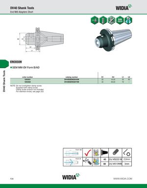 DV40 Shank Tools DV40 Shank Tools End Mill Adapters Short SEM MM-DV Form B/AD order number catalog number D1 D2 L1 L9 1263821 DV40BSEM25045M 25 44,45 45 60 1263822 DV40BSEM32070M 32 65,50 70 — NOTE: Do not overtighten clamp screw. Supplied with clamp screw. Clamp screw wrench not included. For retention knobs, see page J33. F28 WWW.WIDIA.COM