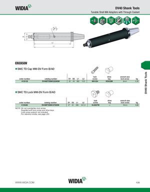 DV40 Shank Tools DV40 Shank Tools Tunable Shell Mill Adapters with Through Coolant D2 D1 L2 L1 SMC TD Cap MM-DV Form B/AD lock drive wrench size order number catalog number D1 D2 L1 L2 screw key lock screw kg 4135132 DV40BTDSMC22260M 22 49 260 13,5 MS1234 KDK22M 8mm 4,30 SMC TD Lock MM-DV Form B/AD lock drive wrench size order number catalog number D1 D2 L1 L2 screw key lock screw kg 4135483 DV40BTDSMC27260M 27 61 260 241,0 KLSS27M — 10mm 5,88 NOTE: Do not overtighten lock screw. Supplied with lock screw and drive keys. Lock screw wrench not included. For retention knobs, see page J33. WWW.WIDIA.COM F29