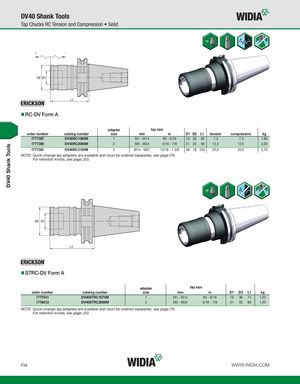 DV40 Shank Tools DV40 Shank Tools Tap Chucks RC Tension and Compression • Solid L1 RC-DV Form A adapter tap size order number catalog number size mm in D1 D2 L1 tension compression kg 1777397 DV40RC1060M 1 M1 - M14 #0 - 9/16 19 36 60 7,5 7,5 1,80 1777380 DV40RC2098M 2 M5 - M24 5/16 - 7/8 31 53 98 12,5 12,5 2,00 1777381 DV40RC3150M 3 M14 - M27 13/16 - 1 3/8 48 78 150 20,0 20,0 2,70 NOTE: Quick-change tap adapters are available and must be ordered separately; see page I76. For retention knobs, see page J33. STRC-DV Form A adapter tap size order number catalog number size mm in D1 D2 L1 kg 1777541 DV40STRC1074M 1 M1 - M14 #0 - 9/16 19 36 74 1,20 1778012 DV40STRC2089M 2 M5 - M24 5/16 - 7/8 31 53 89 1,50 NOTE: Quick-change tap adapters are available and must be ordered separately; see page I76. For retention knobs, see page J33. F34 WWW.WIDIA.COM