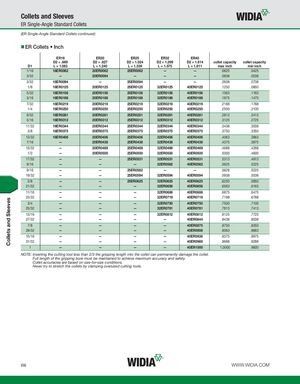 Collets and Sleeves ER Single-Angle Standard Collets (ER Single-Angle Standard Collets continued) ER Collets • Inch ER16 ER20 ER25 ER32 ER40 D2 = .669 D2 = .827 D2 = 1.024 D2 = 1.299 D2 = 1.614 collet capacity collet capacity D1 L = 1.083 L = 1.240 L = 1.339 L = 1.575 L = 1.811 max inch min inch 1/16 16ER0062 20ER0062 25ER0062 — — .0625 .0425 3/32 — 20ER0094 — — — .0938 .0538 3/32 16ER0094 — 25ER0094 — — .0938 .0738 1/8 16ER0125 20ER0125 25ER0125 32ER0125 40ER0125 .1250 .0850 5/32 16ER0156 20ER0156 25ER0156 32ER0156 40ER0156 .1563 .1163 3/16 16ER0188 20ER0188 25ER0188 32ER0188 40ER0188 .1875 .1475 7/32 16ER0219 20ER0219 25ER0219 32ER0219 40ER0219 .2188 .1788 1/4 16ER0250 20ER0250 25ER0250 32ER0250 40ER0250 .2500 .2100 9/32 16ER0281 20ER0281 25ER0281 32ER0281 40ER0281 .2813 .2413 5/16 16ER0312 20ER0312 25ER0312 32ER0312 40ER0312 .3125 .2725 11/32 16ER0344 20ER0344 25ER0344 32ER0344 40ER0344 .3438 .3038 3/8 16ER0375 20ER0375 25ER0375 32ER0375 40ER0375 .3750 .3350 13/32 16ER0406 20ER0406 25ER0406 32ER0406 40ER0406 .4063 .3663 7/16 — 20ER0438 25ER0438 32ER0438 40ER0438 .4375 .3975 15/32 — 20ER0469 25ER0469 32ER0469 40ER0469 .4688 .4288 1/2 — 20ER0500 25ER0500 32ER0500 40ER0500 .5000 .4600 17/32 — — 25ER0531 32ER0531 40ER0531 .5313 .4913 9/16 — — — 32ER0562 40ER0562 .5625 .5225 9/16 — — 25ER0562 — — .5626 .5225 19/32 — — 25ER0594 32ER0594 40ER0594 .5938 .5538 5/8 — — 25ER0625 32ER0625 40ER0625 .6250 .5850 21/32 — — — 32ER0656 40ER0656 .6563 .6163 11/16 — — — 32ER0688 40ER0688 .6875 .6475 23/32 — — — 32ER0719 40ER0719 .7188 .6788 3/4 — — — 32ER0750 40ER0750 .7500 .7100 25/32 — — — 32ER0781 40ER0781 .7813 .7413 13/16 — — — 32ER0812 40ER0812 .8125 .7725 27/32 — — — — 40ER0844 .8438 .8038 7/8 — — — — 40ER0875 .8750 .8350 29/32 — — — — 40ER0906 .9063 .8663 15/16 — — — — 40ER0938 .9375 .8975 31/32 — — — — 40ER0969 .9688 .9288 1 — — — — 40ER1000 1.0000 .9600 NOTE: Inserting the cutting tool less than 2/3 the gripping length into the collet can permanently damage the collet. Full length of the gripping bore must be maintained to achieve maximum accuracy and safety. Collet accuracies are based on size-for-size conditions. Never try to stretch the collets by clamping oversized cutting tools. I56 WWW.WIDIA.COM Collets and Sleeves