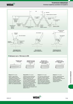 Техническая информация Основные параметры резьбового инструмента шаг вершина ширина вершины профиля угол профиля резьбы боковая сторона минимальный резьбы наружный высота профиля диаметр резьбы резьбы номинальный диаметрмаксимальныйрезьбынаружныйноминальный среднийдиаметрдиаметрвпадинаширина диаметр впадинвпадины профиля метчика цилиндрическая ленточка режущая затылование кромка без затылования затылование передняяповерхность вспомогательнаязадняяповерхность Цилиндрическая Затылованная Комбинированная задняя поверхность задняя поверхность задняя поверхность nnЗаборная часть • Метчики по DIN Заходная часть Заходная часть для Заходная часть Заходная часть 7–10 шагов сквозных отверстий для глухих отверстий для глухих отверстий 3–5 шагов 2–2-1/2 шага 1–2 шага Форма A (6–8 шагов) Форма B/D (3.5–5 шагов) Форма C (2–2.5 шага) Форма E (1.5–2 шага) Форма A представляет Наиболее распространенная Эта короткая заходная часть Форма Е, предназначенная собой наиболее длинную форма заходной части для позволяет нарезать резьбу для нарезания резьбы стандартную заходную часть, обработки сквозных или вблизи дна глухих отверстий. вблизи дна глухих отверстий, обеспечивающую плавное глухих отверстий вручную или Благодаря незначительно является наименее резание. Благодаря большему на станке. Форма B подходит увеличенной длине заходной применяемой формой количеству рабочих зубьев, для метчиков со спиральной части и большему количеству заходной части. требуется меньший крутящий подточкой, а форма D подходит рабочих зубьев, данная форма момент при нарезании резьбы. для метчиков с прямыми и предпочтительнее формы E. винтовыми канавками. Такая форма заходной части более эффективна, чем заходные части формы E или C. widia.com Y105 Техническая информация