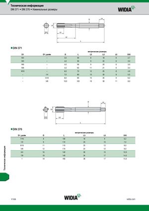 Техническая информация DIN 371 • DIN 376 • Номинальные размеры nnDIN 371 метрические размеры D1 D1, дюйм D L L3 L2 L5 S10 М4 – 3,5 56 8 18 6 2,7 М5 – 4,0 56 9 20 6 3,0 М6 – 4,0 56 9 20 6 3,0 М8 – 4,5 63 11 21 6 3,4 М10 – 6,0 70 12 25 8 4,9 – 1/4 7,0 80 15 30 8 5,5 – 5/16 8,0 90 15 35 9 6,2 – 3/8 10,0 100 19 39 11 8,0 nnDIN 376 метрические размеры D1, дюйм D L L3 L5 S10 7/16 8 100 18 9 6,2 1/2 9 110 23 10 7,0 9/16 11 110 25 12 9,0 5/8 12 110 24 12 9,0 3/4 16 140 30 15 12,0 7/8 18 140 34 17 14,5 1 18 160 38 17 14,5 Y106 widia.com Техническая информация