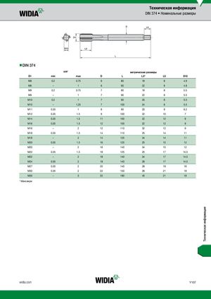 Техническая информация DIN 374 • Номинальные размеры nnDIN 374 шаг метрические размеры D1 min max D L L3* L5 S10 M8 0.2 0.75 6 80 18 8 4.9 M8 – 1 6 90 22 8 4.9 M9 0.2 0.75 7 80 18 8 5.5 M9 – 1 7 90 22 8 5.5 M10 0.2 1 7 90 20 8 5.5 M10 – 1.25 7 100 24 8 5.5 M11 0.35 1 8 90 20 9 6.2 M12 0.35 1.5 9 100 22 10 7 M14 0.35 1.5 11 100 22 12 9 M16 0.35 1.5 12 100 22 12 9 M16 – 2 12 110 32 12 9 M18 0.35 1.5 14 110 25 14 11 M18 – 2 14 125 34 14 11 M20 0.35 1.5 16 125 25 15 12 M20 – 2 16 140 34 15 12 M22 0.35 1.5 18 125 25 17 14.5 M22 – 2 18 140 34 17 14.5 M24 0.35 2 18 140 28 17 14.5 M27 0.35 2 20 140 28 19 16 M30 0.35 2 22 150 28 21 18 M30 – 3 22 180 45 21 18 * Максимум widia.com Y107 Техническая информация