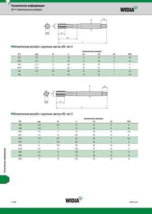 Техническая информация JIS • Номинальные размеры nnМетрическая резьба с крупным шагом JIS, тип 2 метрические размеры D1 шаг D L L3 L2 L5 S10 M3 0.5 4 46 11 19 6 3.2 M3.5 0.6 4 48 13 20 6 3.2 M4 0.7 5 52 13 21 7 4 M4.5 0.75 5 55 13 21 7 4 M5 0.8 5.5 60 16 24 7 4.5 M6 1 6 62 19 29 7 4.5 nnМетрическая резьба с крупным шагом JIS, тип 3 метрические размеры D1 шаг D L L3 L5 S10 M8 1.25 6.2 70 22 8 5 M9 1.25 7 72 22 8 5.5 M10 1.5 7 75 24 8 5.5 M11 1.5 8 80 25 9 6 M12 1.75 8.5 82 29 9 6.5 M14 2 10.5 88 30 11 8 M16 2 12.5 95 32 13 10 M18 2.5 14 100 37 14 11 M20 2.5 15 105 37 15 12 M22 2.5 17 115 38 16 13 M24 3 19 120 45 18 15 Y108 widia.com Техническая информация