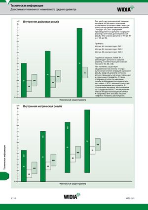 Техническая информация Допустимые отклонения от номинального среднего диаметра Внутренняя дюймовая резьба Для удобства пользователей размеры метчиков WIDIA нового поколения установлены в соответствии с классом точности внутренней винтовой резьбы. Стандарт ISO 2857 определяет производственные допуски на средние диаметры метчиков для метрической резьбы ISO классов допуска от 4H до 8H и от 4G до 6G. Примеры: Метчик 4H соответствует ISO 1 Метчик 6H соответствует ISO 2 Метчик 6G соответствует ISO 3 Подобным образом, ASME B1.1 рекомендует допуски на средний диаметр, соответствующие классам 1B точности 1B, 2B и 3B. Тем не менее, существует общепризнанное мнение, что при выполнении многих операций нарезания резьбы средний диаметр метчиков 2B должен превышать значения, указанные в отраслевых стандартах. К таким операциям относится нарезание 3B резьбы в абразивных материалах или на станках с ЧПУ с высокой точностью позиционирования инструмента. В обозначении метчиков, изготовленных по стандартам WIDIA™, после указания класса посадки используется символ X (например, 6HX или 3BX). На этих графиках показаны расхождения. Номинальный средний диаметр Внутренняя метрическая резьба 7G 6G 6H 4H Номинальный средний диаметр Y110 widia.com Техническая информация ISO 1 ISO 2 ISO 3