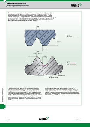 Техническая информация Дюймовая резьба с профилем UNJ Резьба применяется для деталей аэрокосмической и других отраслей, где требуется высокая усталостная прочность. Форма резьбы UNJ определяется ASME B1.15 и отвечает военным техническим условиям MIL-S-8879. Винтовая резьба в сборе состоит из наружной и внутренней резьб. Для сведения к минимуму напряжения в наружной резьбе UNJ необходимо обеспечить радиус впадины в пределах от 0,15011P до 0,18042P, где P — шаг резьбы. Внутренние резьбы UNJ не обязательно должны иметь скругление на вершинах и во впадинах профиля. Гайка: UNx/UNJx Винт: UNx UNJx UNx: R0.14434P-0.125P Поскольку наружные резьбы UNJ необходимо нарезать с Характеристики резьб UNJ представлены в ASME B1.15. определенным радиусом впадины профиля, стандартная Обратите внимание, что в этом стандарте описаны винтовые инструментальная оснастка UN не может использоваться. резьбы UNJ класса 2 и 3. Тем не менее, только резьбы UNJ Тем не менее, внутренние резьбы UNF могут быть выполнены класса 3 отвечают требованиям военных технических условий с использованием метчиков UN со шлифованным профилем MIL-S-8879. Характеристики унифицированных дюймовых резьб резьбы, обеспечивающих надлежащий класс точности. Метчик представлены в ASME B1.1. не обязательно должен иметь маркировку J. Необходимо обратить внимание на сверло под резьбу и обеспечить зазор между внутренним диаметром и радиусом впадины наружной резьбы. Y112 widia.com Техническая информация