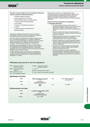 Техническая информация Скорость нарезания резьбы метчиком Факторы, которые следует учесть при выборе оптимальной Метод подачи метчика и тип оборудования также скорости резания при резьбонарезании: оказывают влияние на допустимую скорость резания. При синхронизированном нарезании резьбы метчики могут • Обрабатываемый материал работать на более высокой скорости по сравнению с • Длина заходной части метчика нарезанием резьбы с самозатягиванием метчика в процессе • Доля обрабатываемого профиля резьбы обработки. • Глубина отверстия (длина резьбы) Скорости резания варьируются в зависимости • Шаг резьбы от следующих факторов: • Смазочно-охлаждающие жидкости • По мере увеличения длины резьбы скорость • Станок резания необходимо снижать, поскольку в глубоких • Горизонтальное или вертикальное резьбовых отверстиях скопившаяся стружкаувеличивает трение и препятствует проникновению нарезание резьбы СОЖ. • Скорость резания метчика для глухих отверстий должны быть меньше скорости резания метчика для Определение эффективной рабочей скорости резания сквозных отверстий. для метчика с такой же точностью, как для многих других металлорежущих инструментов, невозможно. • Нарезание резьбы на всю высоту профиля требует более медленной скорости по сравнению с В случае с другими инструментами подача на оборот может нарезанием резьбы на 75% высоты профиля. быть установлена произвольно, а в процессе обработки меняться по мере необходимости. Метчики, напротив, всегда • Скорость резания метчика для нарезания резьбы с должны перемещаться с подачей, равной одному шагу крупным шагом больших диаметров должны быть за оборот. Режимы резания зависят от типа метчика. меньше скорости резания метчика с мелким шагом такого же диаметра. Например, при использовании чистового метчика первая нитка заходной части формирует резьбу на полную высоту, • Количество и качество смазочно-охлаждающей в то время как при использовании метчика с конической жидкости могут изменять допустимую скорость заходной частью или чернового метчика полная высота резьбы резания на величину до 100%. нарезается несколькими нитками. • Скорость резания метчиков для нарезания Глубина профиля резьбы также меняется в зависимости конической резьбы, например, трубных метчиков, от шага. Чем крупнее резьба, тем большее перемещение должна составлять 1/2–3/4 скорости метчика для совершает метчик за один оборот, и большее количество нарезания прямой резьбы аналогичного наружного материала он снимает. диаметра. nnФормулы для расчета частоты вращения SFM = окружная скорость S м/мин = о кружная скорость в футах в минуту в метрах в минуту RPM = частота вращения π = 3.1416 (об/мин) мм/мин = миллиметров в минуту IPM = дюймов в минуту P = шаг (1/число ниток резьбы на дюйм) TPI = ниток резьбы на дюйм Дюймовая система SFM = RPM x диаметр инструмента или 0.26 x RPM x диаметр 3.82 инструмента RPM = 3.82 x SFM диаметр инструмента IPM = RPM или *P x RPM TPI* Метрическая система м/мин = π x диаметр инструмента x RPM 1000 RPM = мм/мин 1000 π x диаметр инструмента мм/мин = мм P x RPM widia.com Y115 Техническая информация