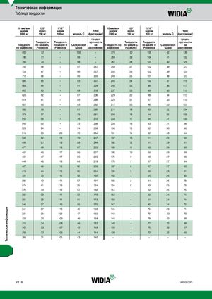 Техническая информация Таблица твердости 10 мм/мин 120° 1/16” 10 мм/мин 120° 1/16” шарик конус шарик 1000 шарик конус шарик 1000 3000 кг 150 кг 100 кг модель С фунт/дюйм2 3000 кг 150 кг 100 кг модель С фунт/дюйм2 предел предел Твердость Твердость прочности Твердость Твердость прочности Твердость по шкале С по шкале B Склероскоп на Твердость по по шкале С по шкале B Склероскоп на по Бринеллю Роквелла Роквелла Шора растяжение Бринеллю Роквелла Роквелла Шора растяжение 800 72 – 100 – 276 30 105 42 136 780 71 – 99 – 269 29 104 41 132 760 70 – 98 – 261 28 103 40 129 745 68 – 97 367 258 27 102 39 127 725 67 – 96 357 255 26 102 39 125 712 66 – 95 350 249 25 101 38 123 682 65 – 93 337 245 24 100 37 119 668 64 – 91 326 240 23 99 36 117 652 63 – 89 318 237 23 99 35 115 626 62 – 87 306 229 22 98 34 113 614 61 – 85 299 224 21 97 33 110 601 60 – 83 292 217 20 96 33 107 590 59 – 81 290 211 19 95 32 104 576 57 – 79 281 206 18 94 32 102 552 56 – 76 270 203 17 94 31 100 545 55 – 75 268 200 16 93 31 98 529 54 – 74 259 196 15 92 30 96 514 53 120 72 254 191 14 92 30 94 502 52 119 70 247 187 13 91 29 92 495 51 119 69 244 185 12 91 29 91 477 49 118 67 233 183 11 90 28 90 461 48 117 66 227 180 10 89 28 89 451 47 117 65 223 175 9 88 27 86 444 46 116 64 219 170 7 87 27 84 427 46 115 62 209 167 6 87 27 82 415 44 115 60 204 165 5 86 26 81 401 43 114 58 196 163 4 85 26 80 388 42 114 57 191 160 3 84 25 78 375 41 113 55 184 156 2 83 25 76 370 40 112 54 182 154 1 82 25 75 362 39 111 53 179 152 – 82 24 74 351 38 111 51 173 150 – 81 24 74 346 37 110 50 170 147 – 80 24 72 341 37 110 49 168 145 – 79 23 71 331 36 109 47 163 143 – 79 23 70 323 35 109 46 158 141 – 78 23 69 311 34 108 46 153 140 – 77 22 69 301 33 107 45 148 135 – 75 22 67 293 32 106 44 144 130 – 72 22 65 285 31 105 43 140 – – – – – Y118 widia.com Техническая информация