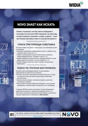 NOVO ЗНАЕТ КАК ИСКАТЬ Взамен устаревшего способа поиска необходимого инструмента по каталогу NOVO предлагает альтернативу, которая позволить сэкономить и время, и деньги, - поиск при помощи советника и поиск по группам инструмента. ПОИСК ПРИ ПОМОЩИ СОВЕТНИКА Вы можете выбрать инструмент, описав задачу, для выполнения которой он необходим: • Определите вид обработки (фрезерование плоскости, обработка паза, сверление глухого отверстия и т.п.). • Задайте ограничивающие условия (геометрические параметры, обрабатываемый материал, требуемую точность и т.п.). • Задайте желаемую последовательность операций (выполнить за один проход, разбить на черновую и чистовую обработку и т.п.). • Получите варианты решений, которые подходят для выполнения Вашей задачи. ПОИСК ПО ГРУППАМ ИНСТРУМЕНТА Вы можете найти необходимое решение, воспользовавшись иерархической системой поиска инструмента: • Если Вы точно знаете, какой именно инструмент Вам нужен, а также его номер по каталогу, Вы можете воспользоваться функцией быстрого поиска. • Фильтры поиска позволяют значительно сократить количество потенциальных решений. • После выбора инструмента NOVO дает возможность также получить информацию и о комплектующих, которые могут быть необходимы. C помощью NOVO Вы сможете использовать на своем оборудовании правильные инструменты в правильной последовательности. Это обеспечивает безупречное выполнение любой операции и максимально повышает эффективность производства. widia.com/novo