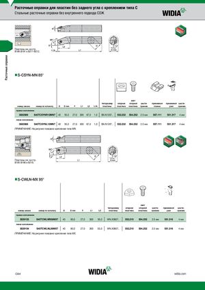 Расточные оправки Расточные оправки для пластин без заднего угла с креплением типа C Стальные расточные оправки без внутреннего подвода СОЖ Пластины см. на стр. B186-В191 и В211-В212. nnS-CSYN-MN 85° винт типоразмер опорная опорной шести- прижимная прижимной шести- номер заказа номер по каталогу D D min F L1 L2 L1A пластины пластина пластины гранник планка узел гранник правое исполнение 3883569 S40TCSYNR12MN7 40 55,0 27,0 300 67,0 1,0 SN.N1207.. 552.232 554.252 2.5 мм 557.111 551.317 4 мм левое исполнение 3883568 S40TCSYNL12MN7 40 55,0 27,0 300 67,0 1,0 SN.N1207.. 552.232 554.252 2.5 мм 557.111 551.317 4 мм ПРИМЕЧАНИЕ: На рисунке показано крепление типа MN. Пластины см. на стр. B195-В198 и В218. nnS-CWLN-MX 95° винт типоразмер опорная опорной шести- прижимной шести- номер заказа номер по каталогу D D min F L1 L2 пластины пластина пластины гранник узел гранник правое исполнение 3029153 S40TCWLNR08MX7 40 80,0 27,0 300 55,0 WN.X0807.. 552.210 554.252 2.5 мм 551.316 4 мм левое исполнение 3029154 S40TCWLNL08MX7 40 80,0 27,0 300 55,0 WN.X0807.. 552.210 554.252 2.5 мм 551.316 4 мм ПРИМЕЧАНИЕ: На рисунке показано крепление типа MX. C64 widia.com