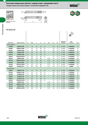 Расточные оправки Расточные оправки для пластин с задним углом с креплением типа S Твердосплавные расточные оправки с внутренним подводом СОЖ Пластины см. на стр. B30-В46. nnE-SCLC 95° типоразмер винт номер заказа номер по каталогу D D min F L1 A CS γF° γP° пластины пластины Torx правое исполнение 2010068 E08KSCLCR06 8 11,0 6,0 125 3,0 — -12.0 0.0 CC..0602.. 12148036300 T8 2023603 E08KSCLCR065 8 10,0 5,0 125 3,0 — -15.0 0.0 CC..0602.. 12148036300 T8 2031021 E10MSCLCR06 10 13,0 7,0 150 3,5 — -10.0 0.0 CC..0602.. 12148068700 T8 2023608 E12QSCLCR06 12 16,0 9,0 180 4,5 — -8.0 0.0 CC..0602.. 12148068700 T8 2010139 E16RSCLCR09 16 20,0 11,0 200 4,5 — -7.0 0.0 CC..0903.. 12148038800 T15 2023614 E16RSCLCR09T3 16 20,0 11,0 200 4,5 — -7.0 0.0 CC..09T3.. 12148038800 T15 2023621 E20SSCLCR09 20 25,0 13,0 250 — G 1/8 -5.0 0.0 CC..0903.. 12148038800 T15 2010184 E20SSCLCR09T3 20 25,0 13,0 250 — G 1/8 -5.0 0.0 CC..09T3.. 12148038800 T15 2031029 E25TSCLCR09 25 32,0 17,0 300 — G 1/4 -3.0 0.0 CC..0903.. 12148038800 T15 2010224 E25TSCLCR09T3 25 32,0 17,0 300 — G 1/4 -3.0 0.0 CC..09T3.. 12148038800 T15 2023632 E32USCLCR12 32 40,0 22,0 350 — G 1/4 -10.0 0.0 CC..1204.. MS2260 T20 левое исполнение 2023601 E08KSCLCL06 8 11,0 6,0 125 3,0 — -12.0 0.0 CC..0602.. 12148036300 T8 2031020 E08KSCLCL065 8 10,0 5,0 125 3,0 — -15.0 0.0 CC..0602.. 12148036300 T8 2031022 E10MSCLCL06 10 13,0 7,0 150 3,5 — -10.0 0.0 CC..0602.. 12148036300 T8 2023607 E12QSCLCL06 12 16,0 9,0 180 4,5 — -8.0 0.0 CC..0602.. 12148068700 T8 2023613 E16RSCLCL09 16 20,0 11,0 200 4,5 — -7.0 0.0 CC..0903.. 12148038800 T15 2023615 E16RSCLCL09T3 16 20,0 11,0 200 4,5 — -7.0 0.0 CC..09T3.. 12148038800 T15 2031026 E20SSCLCL09 20 25,0 13,0 250 — G 1/8 -5.0 0.0 CC..0903.. 12148038800 T15 2031027 E20SSCLCL09T3 20 25,0 13,0 250 — G 1/8 -5.0 0.0 CC..09T3.. 12148038800 T15 2010215 E25TSCLCL09 25 32,0 17,0 300 — G 1/4 -3.0 0.0 CC..0903.. 12148038800 T15 2031028 E25TSCLCL09T3 25 32,0 17,0 300 — G 1/4 -3.0 0.0 CC..09T3.. 12148038800 T15 C68 widia.com