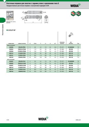Расточные оправки Расточные оправки для пластин с задним углом с креплением типа S Твердосплавные расточные оправки с внутренним подводом СОЖ Пластины см. на стр. B30-В46. nnE-SCLP 95° типоразмер винт номер заказа номер по каталогу D D min F L1 A γF° пластины пластины Torx правое исполнение 2023598 E06JSCLPR04 6 8,0 4,5 110 2,0 -10.0 CP..04T1.. 12148005800 T6 5093094 E08KSCLPR06A 8 11,0 6,0 125 2,4 -6.0 CP..0602.. MS1939 T7 5093098 E10MSCLPR06A 10 13,0 7,0 150 3,2 -4.0 CP..0602.. MS1939 T7 5093144 E12QSCLPR06 12 16,0 9,0 180 4,8 -3.0 CP..0602.. MS1153 T7 5093181 E16RSCLPR09 16 20,0 11,0 200 5,5 -4.0 CP..09T3.. MS1155 T15 5093185 E20SSCLPR09 20 25,0 13,0 250 7,1 -2.0 CP..09T3.. MS1155 T15 левое исполнение 2023597 E06JSCLPL04 6 8,0 4,5 110 2,0 -10.0 CP..04T1.. 12148005800 T6 5093093 E08KSCLPL06A 8 11,0 6,0 125 2,4 -6.0 CP..0602.. MS1939 T7 5093097 E10MSCLPL06A 10 13,0 7,0 150 3,2 -4.0 CP..0602.. MS1939 T7 5093143 E12QSCLPL06 12 16,0 9,0 180 4,8 -3.0 CP..0602.. MS1153 T7 5093149 E16RSCLPL09 16 20,0 11,0 200 5,5 -4.0 CP..09T3.. MS1155 T15 5093184 E20SSCLPL09 20 25,0 13,0 250 7,1 -2.0 CP..09T3.. MS1155 T15 C70 widia.com