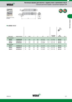 Расточные оправки Расточные оправки для пластин с задним углом с креплением типа S Стальные расточные оправки с внутренним подводом СОЖ Пластины см. на стр. B47-В64. nnA-SDQC 107,5° типоразмер винт номер заказа номер по каталогу D D min F L1 CS γF° пластины пластины Torx правое исполнение 3883476 A16RSDQCR07 16 20,0 11,0 200 1/8-27 NPT -5.0 DC..0702.. MS1153 T7 3883474 A20SSDQCR11 20 25,0 13,0 250 1/8-27 NPT -5.0 DC..11T3.. MS1155 T15 3883462 A25TSDQCR11 25 32,0 17,0 300 1/4-18 NPT -4.0 DC..11T3.. MS1155 T15 левое исполнение 3883477 A16RSDQCL07 16 20,0 11,0 200 1/8-27 NPT -5.0 DC..0702.. MS1153 T7 3883475 A20SSDQCL11 20 25,0 13,0 250 1/8-27 NPT -5.0 DC..11T3.. MS1155 T15 3883473 A25TSDQCL11 25 32,0 17,0 300 1/4-18 NPT -4.0 DC..11T3.. MS1155 T15 widia.com C71