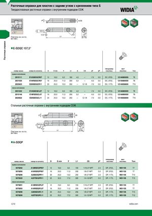Расточные оправки Расточные оправки для пластин с задним углом с креплением типа S Твердосплавные расточные оправки с внутренним подводом СОЖ Пластины см. на стр. B47-В64. nnE-SDQC 107,5° типоразмер винт номер заказа номер по каталогу D D min F L1 A CS γF° γP° пластины пластины Torx правое исполнение 2010111 E12QSDQCR07 12 16,0 9,0 180 4,5 — -7.0 0.0 DC..0702.. 12148080000 T8 2031025 E16RSDQCR07 16 20,0 11,0 200 5,5 — -5.0 0.0 DC..0702.. 12148080000 T8 2023623 E20SSDQCR11 20 25,0 13,0 250 — G 1/8 -7.0 0.0 DC..11T3.. 12148038800 T15 левое исполнение 2031023 E12QSDQCL07 12 16,0 9,0 180 4,5 — -7.0 0.0 DC..0702.. 12148080000 T8 2010148 E16RSDQCL07 16 20,0 11,0 200 5,5 — -5.0 0.0 DC..0702.. 12148080000 T8 2023622 E20SSDQCL11 20 25,0 13,0 250 — G 1/8 -7.0 0.0 DC..11T3.. 12148038800 T15 Стальные расточные оправки с внутренним подводом СОЖ Пластины см. на стр. B47-В64. nnA-SDQP типоразмер винт номер заказа номер по каталогу D D min F L1 CS γF° пластины пластины Torx правое исполнение 5078292 A12MSDQPR07 12 16,0 9,0 150 1/16-27 NPT 2.0 DP..0702.. MS1153 T7 5078295 A16RSDQPR07 16 20,0 11,0 200 1/8-27 NPT 0.0 DP..0702.. MS1153 T7 5078298 A20SSDQPR11 20 25,0 13,0 250 1/8-27 NPT 2.0 DP..11T3.. MS1155 T15 5078320 A25TSDQPR11 25 32,0 17,0 300 1/4-18 NPT 0.0 DP..11T3.. MS1155 T15 левое исполнение 5078291 A12MSDQPL07 12 16,0 9,0 150 1/16-27 NPT 2.0 DP..0702.. MS1153 T7 5078293 A16RSDQPL07 16 20,0 11,0 200 1/8-27 NPT 0.0 DP..0702.. MS1153 T7 5078296 A20SSDQPL11 20 25,0 13,0 250 1/8-27 NPT 2.0 DP..11T3.. MS1155 T15 5078299 A25TSDQPL11 25 32,0 17,0 300 1/4-18 NPT 0.0 DP..11T3.. MS1155 T15 C72 widia.com