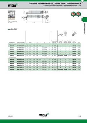 Расточные оправки Расточные оправки для пластин с задним углом с креплением типа S Стальные расточные оправки с внутренним подводом СОЖ Пластины см. на стр. B47-В64. nnA-SDUC 93° винт типоразмер опорная опорной шести- винт номер заказа номер по каталогу D D min F L1 A CS γF° пластины пластина пластины гранник пластины Torx правое исполнение 3883297 A10KSDUCR07 10 13,0 7,0 125 3,2 — -7.0 DC..0702.. — — — MS1153 T7 3883294 A16RSDUCR07 16 20,0 11,0 200 — 1/8-27 NPT -4.0 DC..0702.. — — — MS1153 T7 3883293 A16RSDUCR11 16 20,0 11,0 200 — 1/8-27 NPT -6.0 DC..11T3.. — — — MS1155 T15 3883291 A20SSDUCR11 20 25,0 13,0 250 — 1/8-27 NPT -5.0 DC..11T3.. — — — MS1155 T15 3883288 A25TSDUCR11 25 32,0 17,0 300 — 1/8-27 NPT -4.0 DC..11T3.. — — — MS1155 T15 3883287 A32TSDUCR15 32 40,0 22,0 300 — 1/8-27 NPT -7.0 DC..1504.. SKDP453 SRS4 4 мм MS1158 T15 левое исполнение 3883298 A10KSDUCL07 10 13,0 7,0 125 3,2 — -7.0 DC..0702.. — — — MS1153 T7 3883296 A16RSDUCL07 16 20,0 11,0 200 — 1/8-27 NPT -4.0 DC..0702.. — — — MS1153 T7 3883295 A16RSDUCL11 16 20,0 11,0 200 — 1/8-27 NPT -6.0 DC..11T3.. — — — MS1155 T15 3883292 A20SSDUCL11 20 25,0 13,0 250 — 1/8-27 NPT -5.0 DC..11T3.. — — — MS1155 T15 3883290 A25TSDUCL11 25 32,0 17,0 300 — 1/8-27 NPT -4.0 DC..11T3.. — — — MS1155 T15 3883289 A32TSDUCL15 32 40,0 22,0 300 — 1/8-27 NPT -7.0 DC..1504.. SKDP453 SRS4 4 мм MS1158 T15 widia.com C73