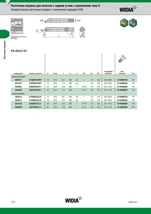 Расточные оправки Расточные оправки для пластин с задним углом с креплением типа S Твердосплавные расточные оправки с внутренним подводом СОЖ Пластины см. на стр. B47-В64. nnE-SDUC 93° типоразмер винт номер заказа номер по каталогу D D min F L1 A CS γF° γP° пластины пластины Torx правое исполнение 2023611 E12QSDUCR07 12 16,0 9,0 180 4,5 — -7.0 0.0 DC..0702.. 12148068700 T8 2010157 E16RSDUCR07 16 20,0 11,0 200 4,5 — -5.0 0.0 DC..0702.. 12148080000 T8 2023624 E20SSDUCR11 20 25,0 13,0 250 — G 1/8 -7.0 0.0 DC..11T3.. 12148038800 T15 2023630 E25TSDUCR11 25 32,0 17,0 300 — G 1/4 -5.0 0.0 DC..11T3.. 12148038800 T15 левое исполнение 2023610 E12QSDUCL07 12 16,0 9,0 180 4,5 — -7.0 0.0 DC..0702.. 12148068700 T8 2023617 E16RSDUCL07 16 20,0 11,0 200 4,5 — -5.0 0.0 DC..0702.. 12148080000 T8 2010193 E20SSDUCL11 20 25,0 13,0 250 — G 1/8 -7.0 0.0 DC..11T3.. 12148038800 T15 2023629 E25TSDUCL11 25 32,0 17,0 300 — G 1/4 -5.0 0.0 DC..11T3.. 12148038800 T15 C74 widia.com