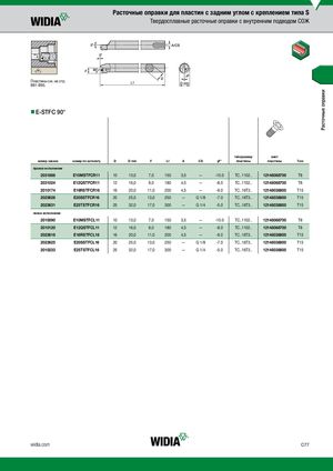 Расточные оправки Расточные оправки для пластин с задним углом с креплением типа S Твердосплавные расточные оправки с внутренним подводом СОЖ Пластины см. на стр. B81-В93. nnE-STFC 90° типоразмер винт номер заказа номер по каталогу D D min F L1 A CS γF° пластины пластины Torx правое исполнение 2031888 E10MSTFCR11 10 13,0 7,0 150 3,5 — -10.0 TC..1102.. 12148068700 T8 2031024 E12QSTFCR11 12 16,0 9,0 180 4,5 — -8.0 TC..1102.. 12148068700 T8 2010174 E16RSTFCR16 16 20,0 11,0 200 4,5 — -9.0 TC..16T3.. 12148038800 T15 2023626 E20SSTFCR16 20 25,0 13,0 250 — G 1/8 -7.0 TC..16T3.. 12148038800 T15 2023631 E25TSTFCR16 25 32,0 17,0 300 — G 1/4 -5.0 TC..16T3.. 12148038800 T15 левое исполнение 2010090 E10MSTFCL11 10 13,0 7,0 150 3,5 — -10.0 TC..1102.. 12148068700 T8 2010120 E12QSTFCL11 12 16,0 9,0 180 4,5 — -8.0 TC..1102.. 12148068700 T8 2023618 E16RSTFCL16 16 20,0 11,0 200 4,5 — -9.0 TC..16T3.. 12148038800 T15 2023625 E20SSTFCL16 20 25,0 13,0 250 — G 1/8 -7.0 TC..16T3.. 12148038800 T15 2010233 E25TSTFCL16 25 32,0 17,0 300 — G 1/4 -5.0 TC..16T3.. 12148038800 T15 widia.com C77