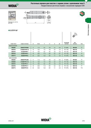 Расточные оправки Расточные оправки для пластин с задним углом с креплением типа S Твердосплавные расточные оправки с внутренним подводом СОЖ Пластины см. на стр. B81-В93. nnE-STFP 90° типоразмер винт номер заказа номер по каталогу D D min F L1 A γF° пластины пластины Torx правое исполнение 5093696 E08KSTFPR09A 8 11,0 6,0 124 2,4 -6.0 TP..0902.. MS1933 T7 5093750 E10MSTFPR11A 10 13,0 7,0 152 3,2 -4.0 TP..1102.. MS1153 T7 5093755 E12QSTFPR11 12 16,0 9,0 181 4,8 -2.0 TP..1102.. MS1153 T7 5093759 E16RSTFPR11 16 20,0 11,0 201 5,5 0.0 TP..1102.. MS1153 T7 5093773 E20SSTFPR16 20 25,0 13,0 251 7,1 -2.0 TP..16T3.. MS1155 T15 левое исполнение 5093694 E08KSTFPL09A 8 11,0 6,0 124 2,4 -6.0 TP..0902.. MS1933 T7 5093699 E10MSTFPL11A 10 13,0 7,0 152 3,2 -4.0 TP..1102.. MS1153 T7 5093754 E12QSTFPL11 12 16,0 9,0 181 4,8 -2.0 TP..1102.. MS1153 T7 5093758 E16RSTFPL11 16 20,0 11,0 201 5,5 0.0 TP..1102.. MS1153 T7 5093772 E20SSTFPL16 20 25,0 13,0 251 7,1 -2.0 TP..16T3.. MS1155 T15 widia.com C79