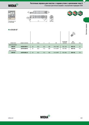 Расточные оправки Расточные оправки для пластин с задним углом с креплением типа S Стальные расточные оправки с внутренним подводом СОЖ Пластины см. на стр. B94-В99. nnA-SVUB 93° типоразмер винт номер заказа номер по каталогу D D min F L1 CS пластины пластины Torx правое исполнение 3883440 A20SSVUBR11 20 25,0 13,0 250 1/8-27 NPT VB..1103.. MS1153 T7 3883438 A25TSVUBR16 25 32,0 17,0 300 1/4-18 NPT VB..1604.. MS1155 T15 левое исполнение 3883439 A25TSVUBL16 25 32,0 17,0 300 1/4-18 NPT VB..1604.. MS1155 T15 widia.com C81