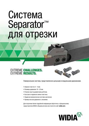 Система Separator™ для отрезки Универсальная система, представленная цельными и модульными державками. • Ширина пластин 2 – 4 мм. • Размеры державок 10 – 32 мм. • Отрезка прутка диаметром до 66 мм. • Быстрая и надежная смена пластины. • Надежная механическая система крепления. • Прямоугольные державки с лезвиями. Для получения более подробной информации обратитесь к официальному представителю WIDIA в Вашем регионе или посетите сайт widia.com.
