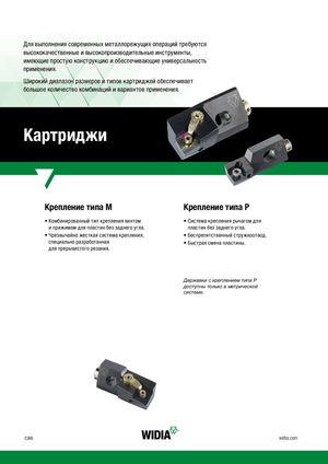 Для выполнения современных металлорежущих операций требуются высококачественные и высокопроизводительные инструменты, имеющие простую конструкцию и обеспечивающие универсальность применения. Широкий диапазон размеров и типов картриджей обеспечивает большое количество комбинаций и вариантов применения. Картриджи Крепление типа M Крепление типа P • К омбинированный тип крепления винтом • Система крепления рычагом для и прижимом для пластин без заднего угла. пластин без заднего угла. • Чрезвычайно жесткая система крепления, • Беспрепятственный стружкоотвод. специально разработанная • Быстрая смена пластины. для прерывистого резания. Державки с креплением типа P доступны только в метрической системе. C86 widia.com