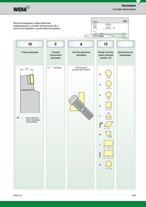 Картриджи Система обозначения Воспользовавшись представленной информацией о системе обозначения, Вы с легкостью выберете нужный Bам инструмент. MCFNR10CA3 10 C A 12 Размер картриджа Условное Система крепления Размер пластины Дополнительная обозначение картриджа (длина режущей информация картриджа кромки L10) C = картридж Конструкция A соответствует ISO 5611 H L10 O L10 P L10 S L10 T H1 = высота режущей L10 кромки картриджа, в миллиметрах. CDE M V L10 W L L10 A B K L10 R D widia.com C89 L10