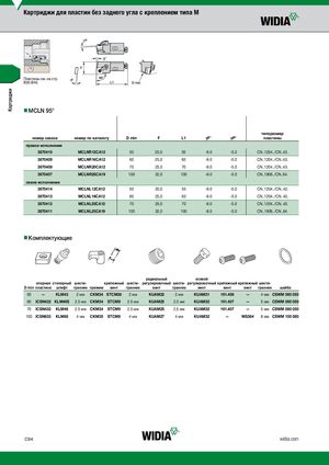 Картриджи Картриджи для пластин без заднего угла с креплением типа М Пластины см. на стр. B30-В46. nnMCLN 95° типоразмер номер заказа номер по каталогу D min F L1 γF° γP° пластины правое исполнение 3870410 MCLNR12CA12 50 20,0 55 -9.0 -5.0 CN..1204../CN..43. 3870409 MCLNR16CA12 60 25,0 63 -9.0 -5.0 CN..1204../CN..43. 3870408 MCLNR20CA12 70 25,0 70 -9.0 -5.0 CN..1204../CN..43. 3870407 MCLNR25CA19 100 32,0 100 -9.0 -5.0 CN..1906../CN..64. левое исполнение 3870414 MCLNL12CA12 50 20,0 55 -9.0 -5.0 CN..1204../CN..43. 3870413 MCLNL16CA12 60 25,0 63 -9.0 -5.0 CN..1204../CN..43. 3870412 MCLNL20CA12 70 25,0 70 -9.0 -5.0 CN..1204../CN..43. 3870411 MCLNL25CA19 100 32,0 100 -9.0 -5.0 CN..1906../CN..64. nnКомплектующие радиальный осевой опорная стопорный шести- крепежный шести- регулировочный шести- регулировочный крепежный крепежный шести- D min пластина штифт гранник прижим винт гранник винт гранник винт винт винт гранник шайба 50 — KLM43 2 мм CKM34 STCM38 2 мм KUAM22 2 мм KUAM31 191.406 — 4 мм CSWM 060 050 60 ICSN432 KLM46S 2.5 мм CKM34 STCM9 2.5 мм KUAM25 2.5 мм KUAM32 191.407 — 5 мм CSWM 080 050 70 ICSN432 KLM46 2.5 мм CKM34 STCM9 2.5 мм KUAM25 2.5 мм KUAM32 191.407 — 5 мм CSWM 080 050 100 ICSN633 KLM68 4 мм CKM35 STCM8 4 мм KUAM27 4 мм KUAM32 — MS364 8 мм CSWM 100 080 C94 widia.com