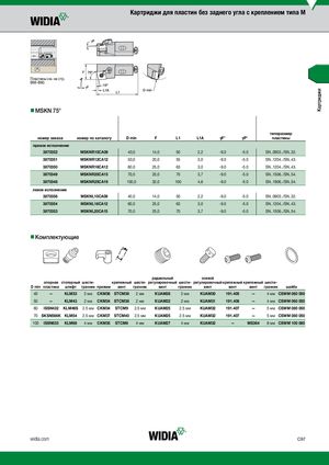 Картриджи Картриджи для пластин без заднего угла с креплением типа М Пластины см. на стр. B68-В80. nnMSKN 75° типоразмер номер заказа номер по каталогу D min F L1 L1A γF° γP° пластины правое исполнение 3870352 MSKNR10CA09 40,0 14,0 50 2,2 -9.0 -5.0 SN..0903../SN..32. 3870351 MSKNR12CA12 50,0 20,0 55 3,0 -9.0 -5.0 SN..1204../SN..43. 3870350 MSKNR16CA12 60,0 25,0 63 3,0 -9.0 -5.0 SN..1204../SN..43. 3870349 MSKNR20CA15 70,0 25,0 70 3,7 -9.0 -5.0 SN..1506../SN..54. 3870348 MSKNR25CA19 100,0 32,0 100 4,6 -9.0 -5.0 SN..1906../SN..54. левое исполнение 3870356 MSKNL10CA09 40,0 14,0 50 2,2 -9.0 -5.0 SN..0903../SN..32. 3870354 MSKNL16CA12 60,0 25,0 63 3,0 -9.0 -5.0 SN..1204../SN..43. 3870353 MSKNL20CA15 70,0 25,0 70 3,7 -9.0 -5.0 SN..1506../SN..54. nnКомплектующие радиальный осевой опорная стопорный шести- крепежный шести- регулировочный шести- регулировочный крепежный крепежный шести- D min пластина штифт гранник прижим винт гранник винт гранник винт винт винт гранник шайба 40 — KLM33 2 мм CKM36 STCM38 2 мм KUAM28 2 мм KUAM30 191.405 — 4 мм CSWM 060 050 50 — KLM43 2 мм CKM34 STCM38 2 мм KUAM22 2 мм KUAM31 191.406 — 4 мм CSWM 060 050 60 ISSN432 KLM46S 2.5 мм CKM34 STCM9 2.5 мм KUAM25 2.5 мм KUAM32 191.407 — 5 мм CSWM 080 050 70 SKSN566K KLM54 2.5 мм CKM37 STCM40 2.5 мм KUAM25 2.5 мм KUAM32 191.407 — 5 мм CSWM 080 050 100 ISSN633 KLM68 4 мм CKM35 STCM8 4 мм KUAM27 4 мм KUAM32 — MS364 8 мм CSWM 100 080 widia.com C97