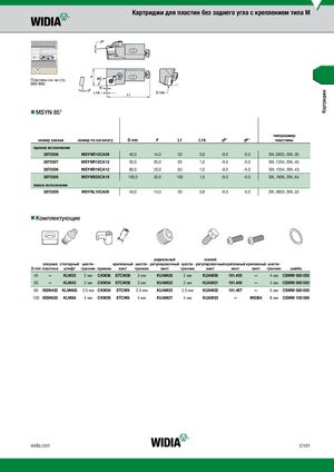 Картриджи Картриджи для пластин без заднего угла с креплением типа М Пластины см. на стр. B68-В80. nnMSYN 85° типоразмер номер заказа номер по каталогу D min F L1 L1A γF° γP° пластины правое исполнение 3870308 MSYNR10CA09 40,0 14,0 50 0,8 -9.0 -5.0 SN..0903../SN..32. 3870307 MSYNR12CA12 50,0 20,0 55 1,0 -9.0 -5.0 SN..1204../SN..43. 3870306 MSYNR16CA12 60,0 25,0 63 1,0 -9.0 -5.0 SN..1204../SN..43. 3870305 MSYNR25CA19 100,0 32,0 100 1,5 -9.0 -5.0 SN..1906../SN..64. левое исполнение 3870309 MSYNL10CA09 40,0 14,0 50 0,8 -9.0 -5.0 SN..0903../SN..32. nnКомплектующие радиальный осевой опорная стопорный шести- крепежный шести- регулировочный шести- регулировочный крепежный крепежный шести- D min пластина штифт гранник прижим винт гранник винт гранник винт винт винт гранник шайба 40 — KLM33 2 мм CKM36 STCM38 2 мм KUAM28 2 мм KUAM30 191.405 — 4 мм CSWM 060 050 50 — KLM43 2 мм CKM34 STCM38 2 мм KUAM22 2 мм KUAM31 191.406 — 4 мм CSWM 060 050 60 ISSN432 KLM46S 2.5 мм CKM34 STCM9 2.5 мм KUAM25 2.5 мм KUAM32 191.407 — 5 мм CSWM 080 050 100 ISSN633 KLM68 4 мм CKM35 STCM8 4 мм KUAM27 4 мм KUAM33 — MS364 8 мм CSWM 100 080 widia.com C101