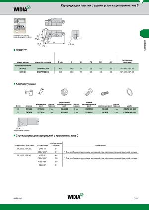 Картриджи Картриджи для пластин с задним углом с креплением типа C Пластины см. на стр. B186-В191 и В211-В212. nnCSRP 75° типоразмер номер заказа номер по каталогу D min F L1 FA λS° γO° пластины правое исполнение 3870435 CSRPR10CA09 40,0 14,0 50 2,2 0.0 0.0 SP..0903../SP..32. 3870434 CSRPR12CA12 50,0 20,0 55 3,0 3.0 0.0 SP..1203../SP..42. nnКомплектующие радиальный осевой крепежный шести- регулировочный шести- регулировочный шести- D min прижим винт гранник винт гранник винт крепежный винт гранник шайба 40 CKM34 STCM38 2 мм KUAM28 2 мм KUAM30 191.405 4 мм CSWM 060 050 50 CKM34 STCM38 2 мм KUAM22 2 мм KUAM31 191.406 4 мм CSWM 060 050 эффективная ширина nnСтружколомы для картриджей с креплением типа С эффективная типоразмер пластины стружколом ширина примечание SP..0903../SP..32. CBS-12 2.1 CBS-12D** 2.1 ** Для дробления стружки как на главной, так и вспомогательной режущей кромке SP..1203../SP..42. CBS16 4.4 CBS-16D** 2.8 ** Для дробления стружки как на главной, так и вспомогательной режущей кромке CBS-16N 3.0 CBS16F 2.1 widia.com C107